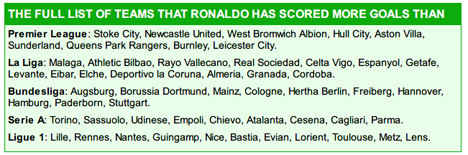 Menurut laporan yang diturunkan oleh Daily Mail, bintang asal Portugal itu telah mencetak gol lebih dari 53 dari 98 tim yang bermain di liga sepakbola tertinggi Inggris, Jerman, Italia, Spanyol, dan Prancis.