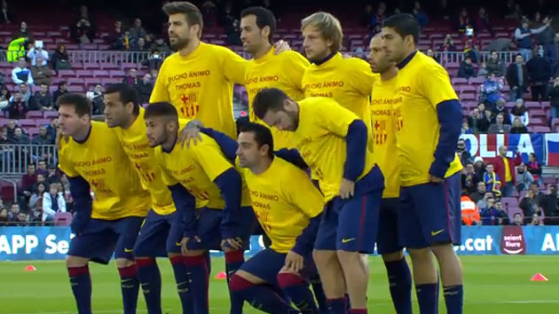Menurut laporan yang diturunkan oleh Marca, tim asuhan Luis Enrique berpose mengenakan kaus berwarna kuning bertuliskan 'Fucho Animo Thomas' atau yang berarti 'Tetap Tegar Thomas' kala mengambil gambar seluruh skuat, untuk memberikan semangat pada sang pemain belakang.