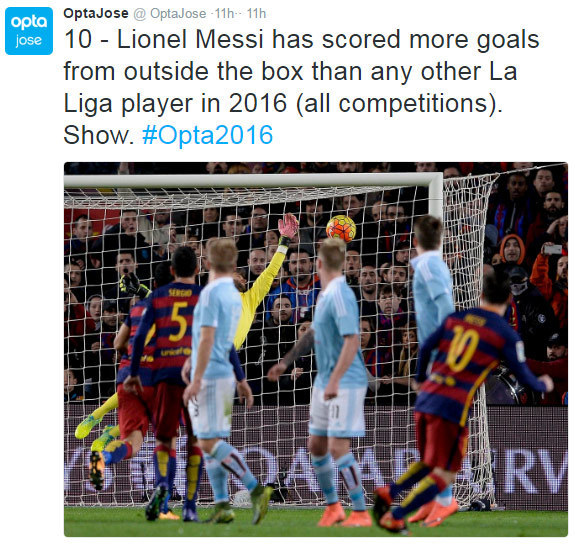 Messi mencetak total 10 gol dari luar kotak penalti di semua kompetisi dengan seragam Barcelona sepanjang tahun 2016. Selama periode tersebut, tak ada pemain lain dari La Liga yang torehan gol luar kotaknya mengungguli sang superstar Argentina.