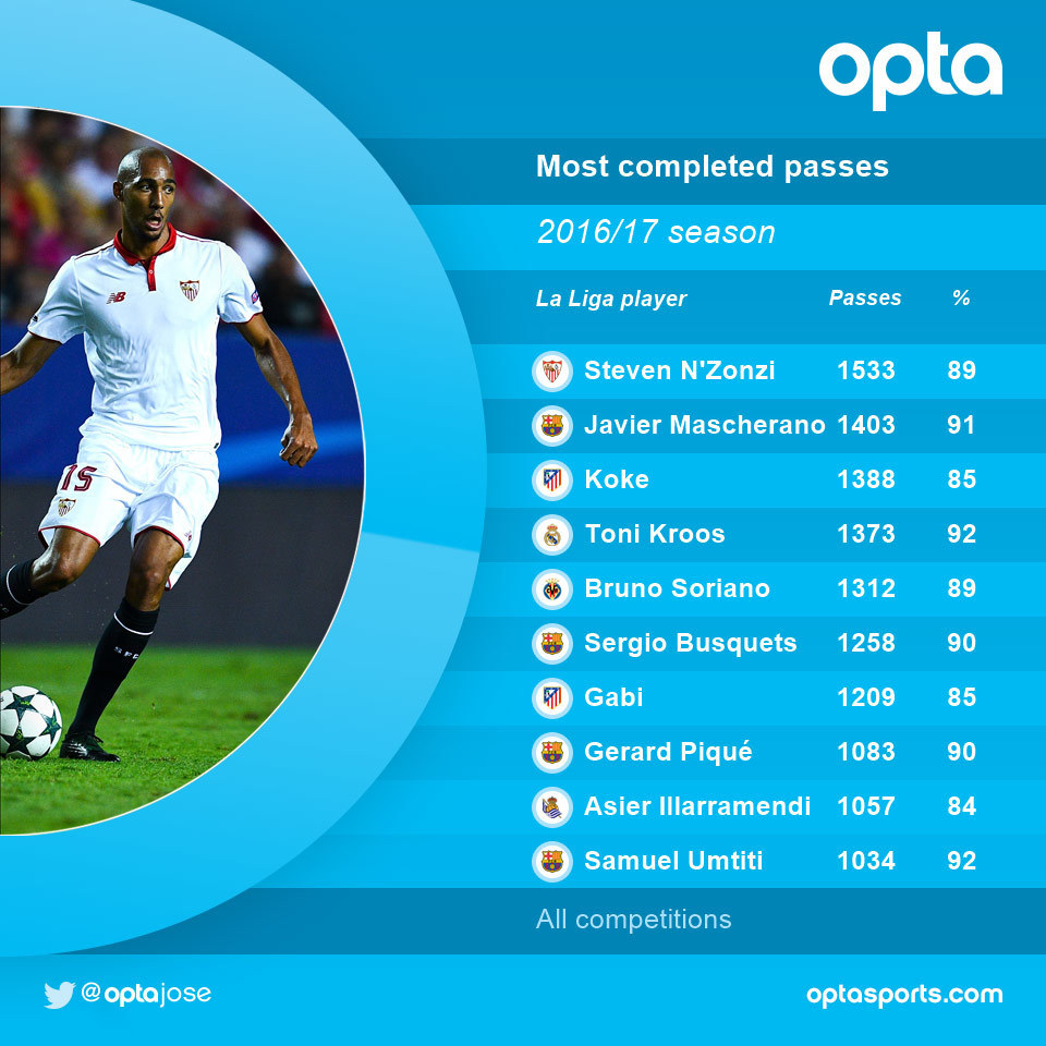 Dalam semua penampilannya bersama Sevilla di semua kompetisi musim 2016/17 sejauh ini (La Liga, Liga Champions, Piala Super Eropa, Supercopa de Espana), N'Zonzi sudah membukukan 1533 operan akurat. Angka itu mengungguli pemain-pemain berbasis La Liga lainnya, termasuk Javier Mascherano (Barcelona), Koke (Atletico Madrid) dan Toni Kroos (Real Madrid).