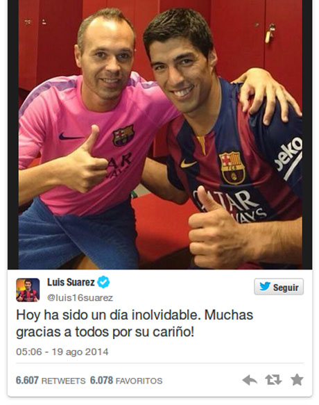 "Hari ini adalah hari yang penuh dengan kenangan. Terima kasih semua untuk perhatian yang anda berikan pada saya," demikian pesan yang ditulis oleh Suarez, sembari mengunggah foto dirinya bersama wakil kapten tim, Andres Iniesta.