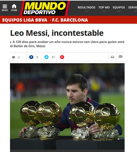 Media Catalan rupanya amat yakin Messi bakal dinobatkan menjadi pemain terbaik dunia untuk ke-5 kalinya sepanjang karir, usai ia mencatat prestasi luar biasa musim lalu. Ia berhasil membawa Barcelona meraih tiga trofi sekaligus alias treble winners.