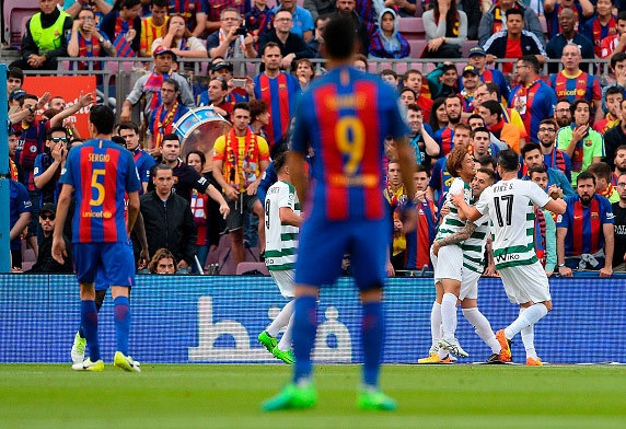 Namun, Barcelona bangkit dan membalikkan keadaan. Diawali gol bunuh diri David Junca menit 63, Barcelona lalu menyamakan kedudukan lewat Luis Suarez di menit 73. Barcelona kemudian ganti memimpin melalui penalti Lionel Messi menit 75, yang sebelumnya gagal penalti di menit 69, dan menegaskan kemenangan mereka lewat gol kedua Messi di penghujung laga.