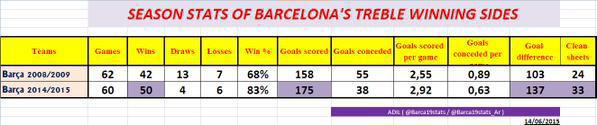 Barcelona musim 14/15 memenangkan lebih banyak pertandingan (50 vs 42), kalah lebih sedikit (6 vs 7) dan kemasukan lebih sedikit gol (38 vs 55) dibandingkan dengan Barcelona di musim 2008/09.