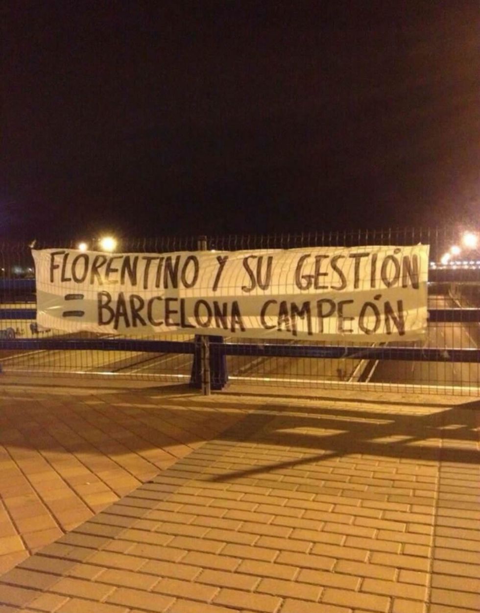 Disebutkan bahwa spanduk tersebut dibuat oleh ultras Madrid, yang menuntut mundurnya sang presiden dari jabatannya. Salah satunya seperti yang terlihat di bawah ini, dengan bunyi pesan 'Perez terus memimpin = Barcelona juara'.