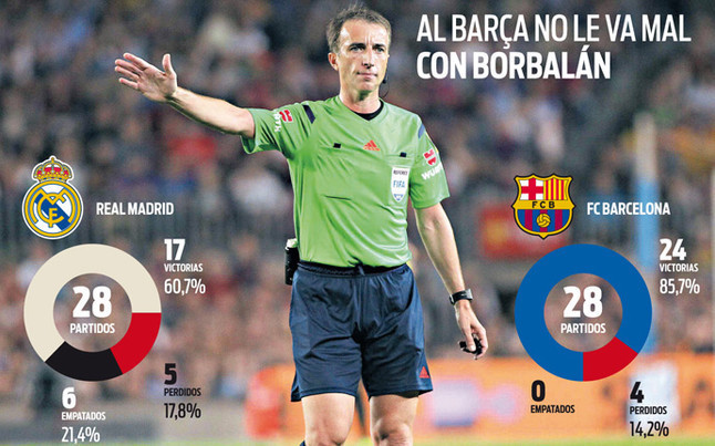 Menurut catatan yang dikeluarkan oleh Sport, Borbalan sudah 28 kali memimpin pertandingan yang melibatkan Blaugrana dan 24 di antaranya berakhir untuk kemenangan Lionel Messi dkk, atau dengan persentase 85,7 persen. Sementara itu, empat laga lainnya berakhir dengan kekalahan.
