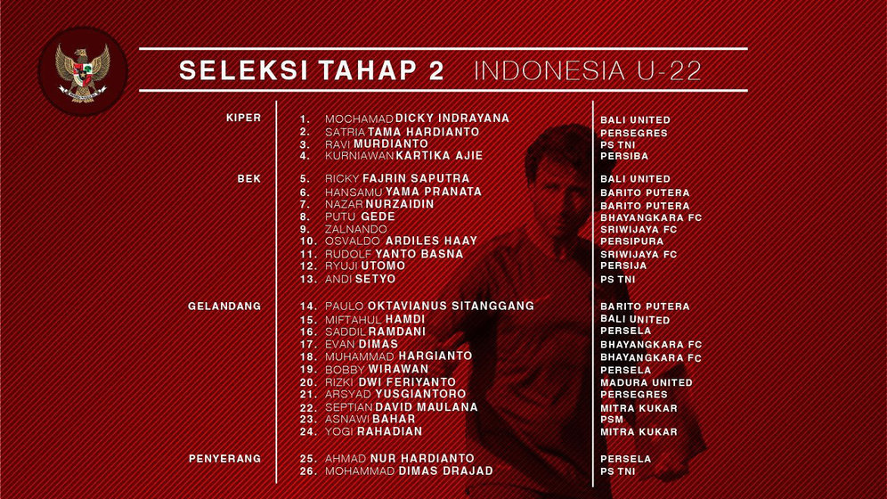Berikut adalah daftar 26 pemain yang dipanggil untuk seleksi tahap dua: