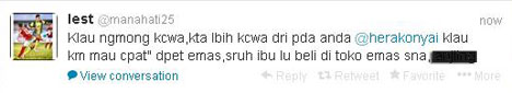 Sebelumnya pemain 20 tahun itu memposting tweet yang berisi permintaan maaf karena gagal mempersembahkan medali emas bagi tanah air. Tweet itu pun memancing seseorang untuk memberikan komentar bernada kekecewaan.