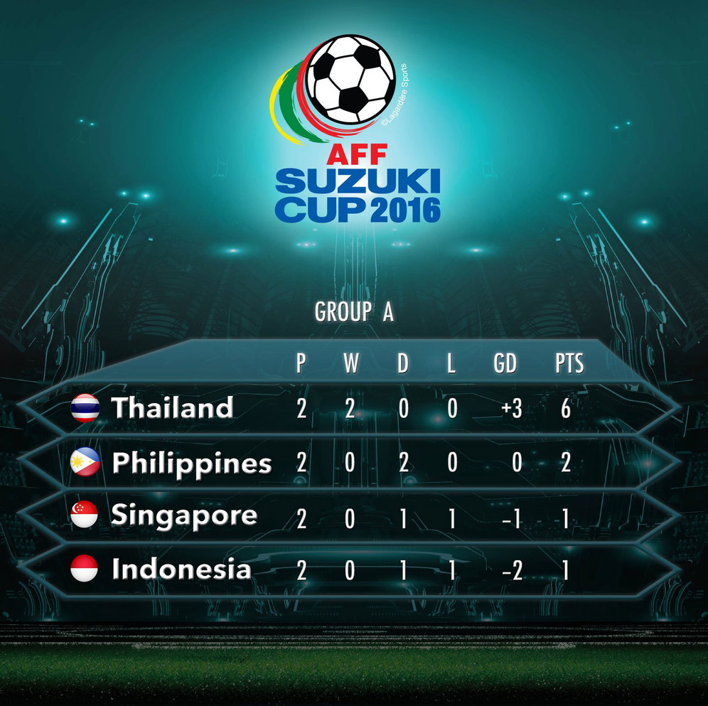 Thailand yang sukses menyapu bersih dua kemenangan mengumpulkan enam poin. Kemenangan terakhir tim asuhan Kiatisuk Senamuang ini diraih saat melawan Singapura dengan skor 1-0, Selasa .