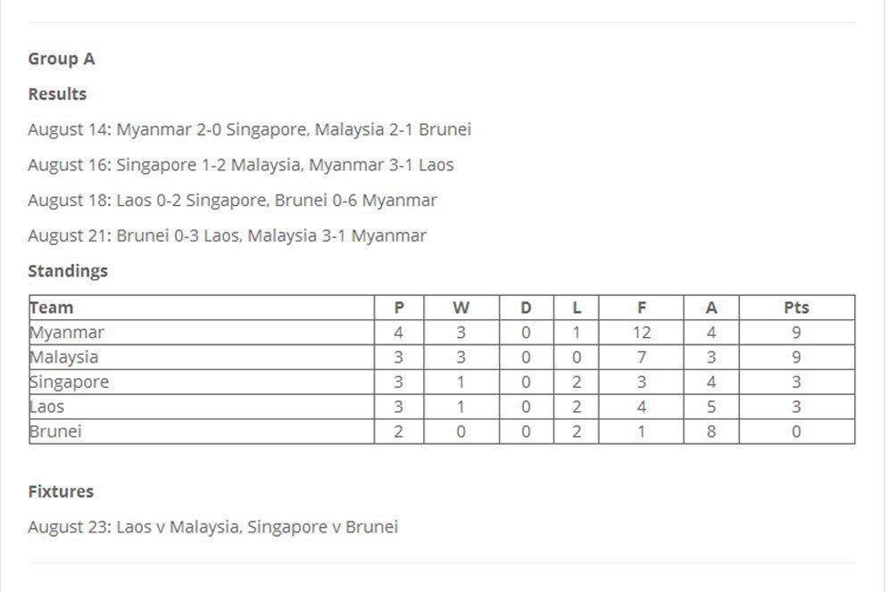Saat ini Malaysia masih berada di posisi kedua Grup A dengan sembilan poin, jumlah poin tersebut sama dengan milik Myanmar yang berada di puncak klasemen. Tapi, Malaysia masih punya satu pertandingan melawan Laos yang akan dimainkan pada hari Rabu (23/8) besok.