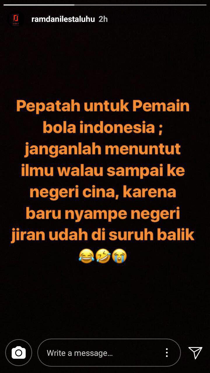 “Pepatah untuk Pemain bola Indonesia: janganlah menuntut ilmu walau sampai ke negeri Cina, karena baru nyampe negeri jiran udah disuruh balik lagi,” demikian kata Ramdhani di Instastory.