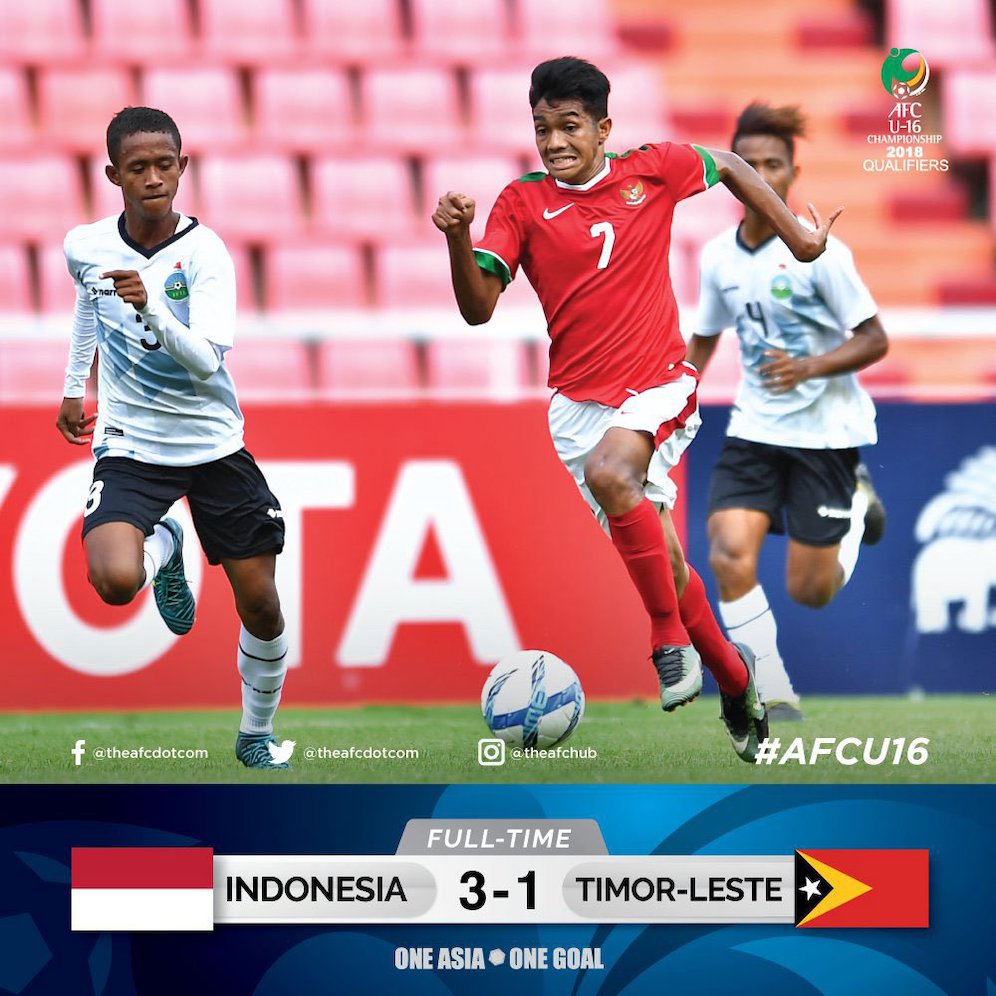 Bola.net - - Timnas Indonesia kembali meraih hasil yang positif di ajang Kualifikasi Piala AFC U-16 2018. Kali ini, Garuda Asia sukses membekuk Timor Leste dengan skor 3-1 di Stadion Rajamanggala, Bangkok, Senin (18/9) malam WIB.