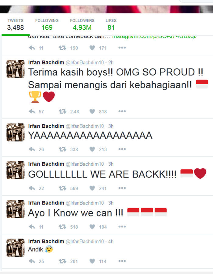 Tidak bisa tampil di Piala AFF 2016 tak lantas membuat Irfan Bachdim melupakan perjuangan rekan-rekannya. Bachdim masih aktif mengikuti perjuangan Indonesia bahkan dengan antusiasme yang begitu tinggi.