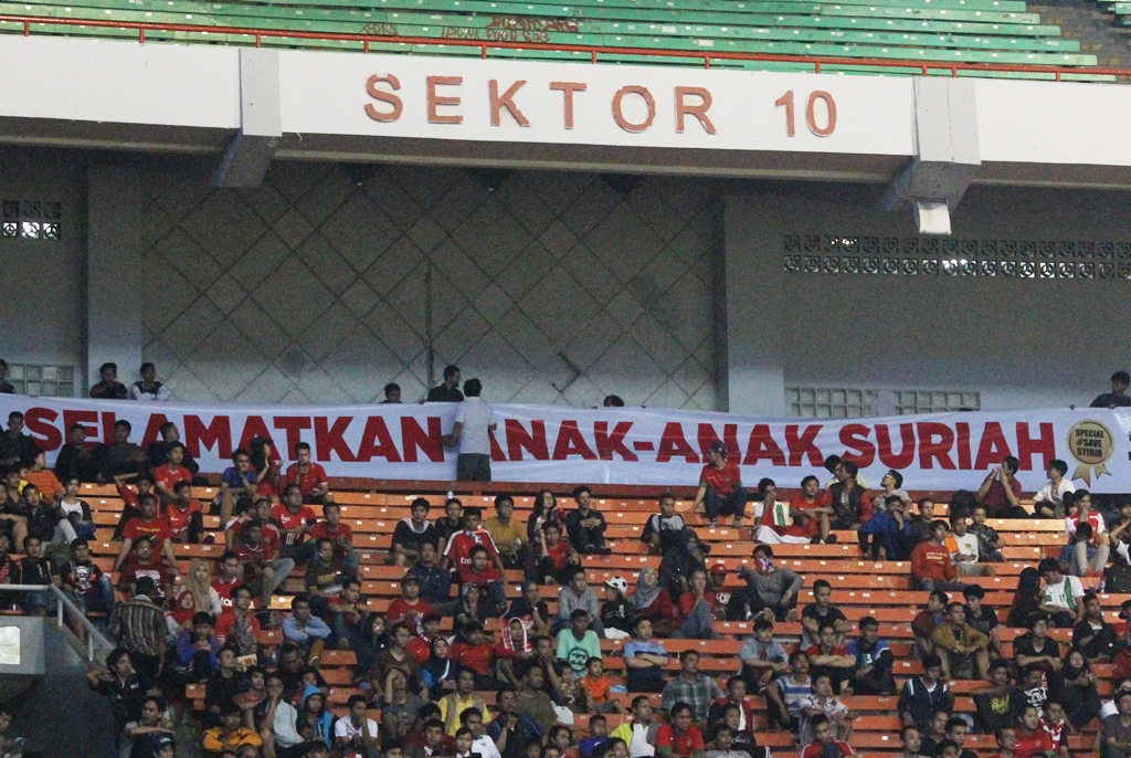 "Dari Indonesia Selamatkan Anak-anak Suriah #savethechildrenforsyria,” demikian bunyi spanduk yang tidak berkenan di hati para pemain Suriah.