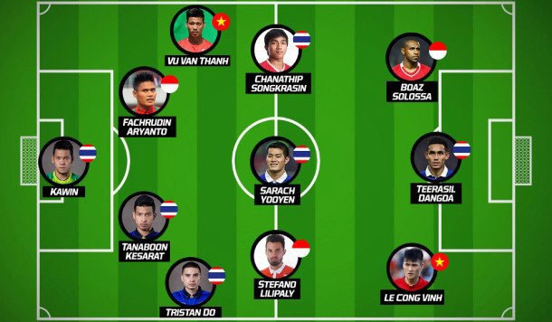 Dengan sumbangan tiga pemain, Indonesia menjadi negara kedua yang menyumbang pemain paling banyak. Kalah dari Thailand yang enam pemainnya masuk dalam skuat terbaik. Berikut ini adalah susunan selengkapnya: