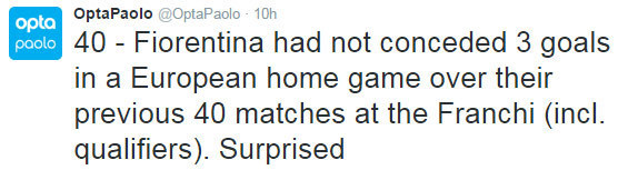 Kekalahan mengejutkan ini seperti aib bagi Fiorentina. Pasalnya, Fiorentina tak pernah kebobolan sampai tiga gol di sebuah laga kandang kompetisi Eropa dalam 40 penampilan mereka sebelumnya di Franchi (termasuk babak kualifikasi).