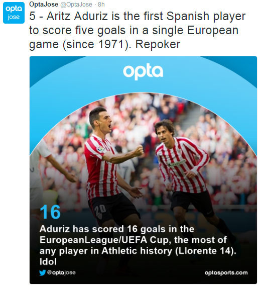 Aduriz juga tercatat sebagai pemain Spanyol pertama yang mencetak lima gol dalam sebuah pertandingan Eropa sejak 1971.