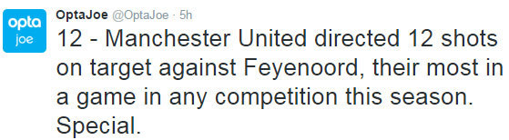 Dari 22 tembakan itu, di mana Feyenoord cuma 5, 12 di antaranya tepat sasaran. Total 12 shots on target melawan Feyenoord tercatat sebagai shots on target terbanyak MU dalam sebuah pertandingan di semua kompetisi musim ini.